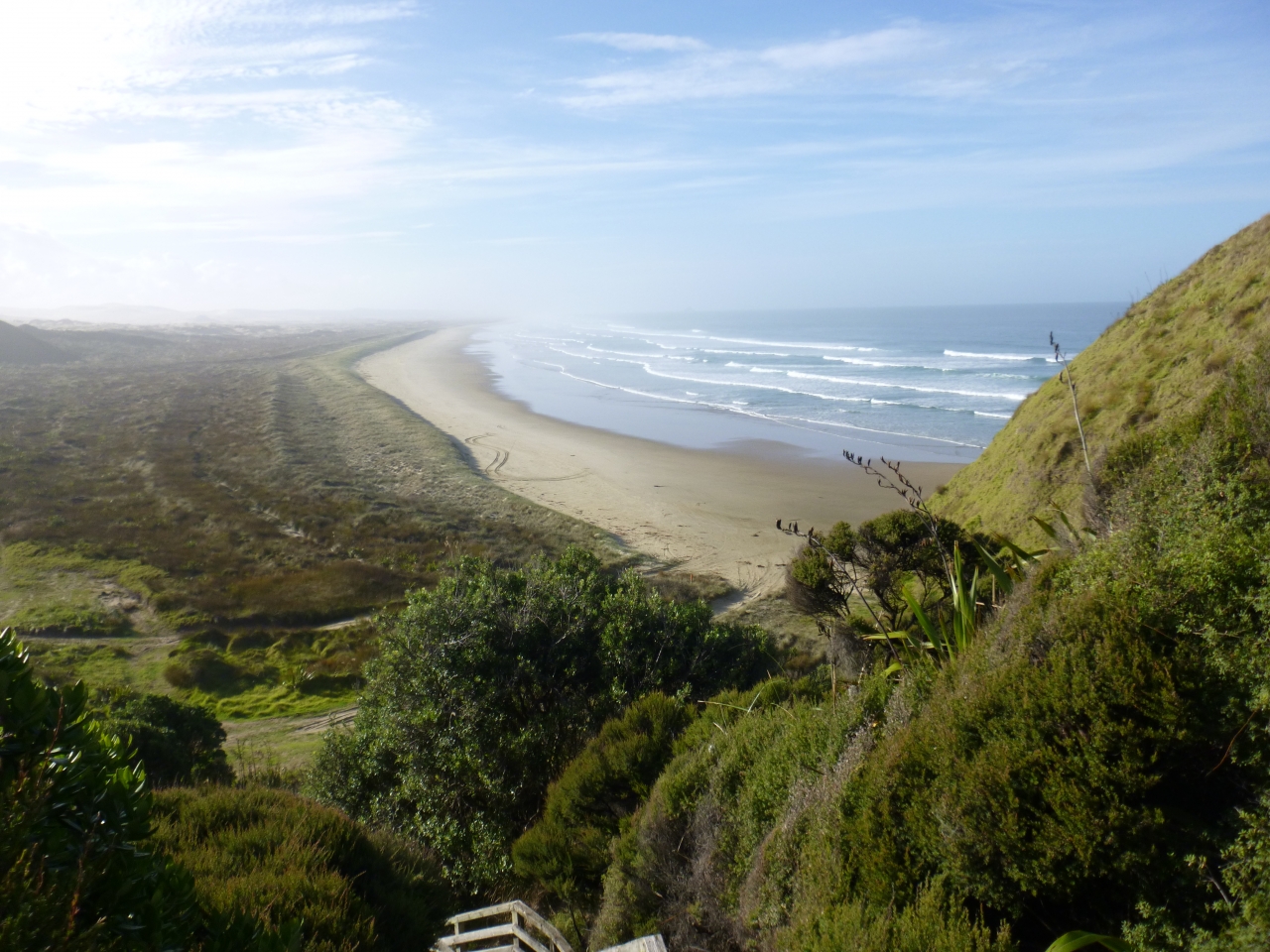 On our third day we crossed elevated scrubland with views towards Te Paki farm and the giant sand dunes, before reaching the long flights of stairs at Scott Point and descending to the endless expanse of Ninety Mile Beach.