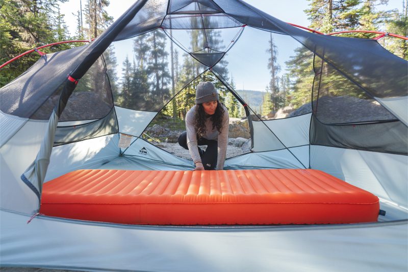 At 11.7cm thick and with a larger than normal sleeping area, it delivers excellent stability. It’s made of a plush stretch-knit fabric – a stretchy baselayer-like fabric that is softer to the touch than the nylon typically used on sleeping mats. Its stretch properties help to minimise pressure points by conforming to the shape of your body.