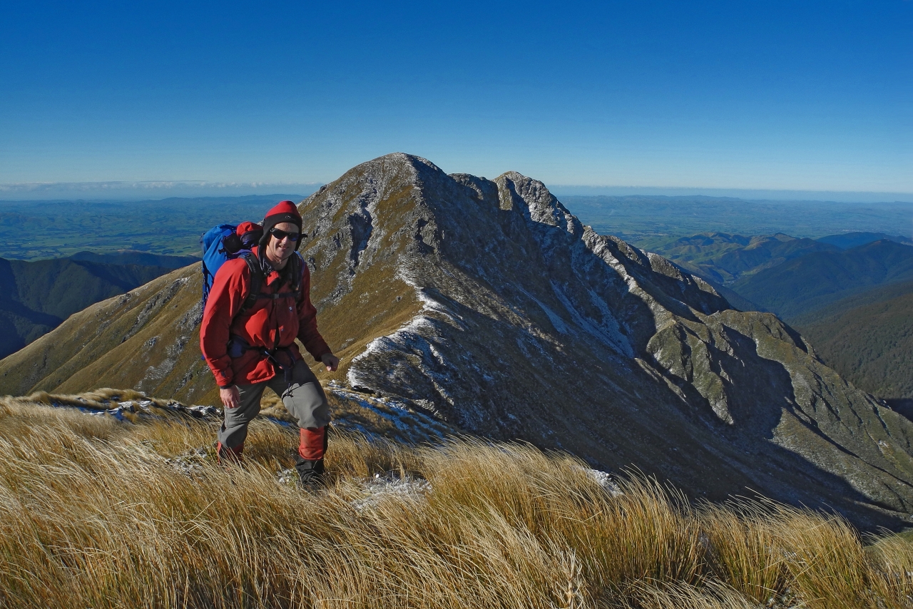 The 150m descent of Mitre’s steeper north-west face, also dusted with snow, was the trickiest section of the day’s route. Once on top of Brockett, 1538m, I got a nice view of Mitre, back-dropped by the Wairarapa. And looking north-west I could see the red roof of Tarn Ridge Hut gleaming at me in a sea of green, brown and gold; offset by the blues and greys of Kapiti Island in the far distance.