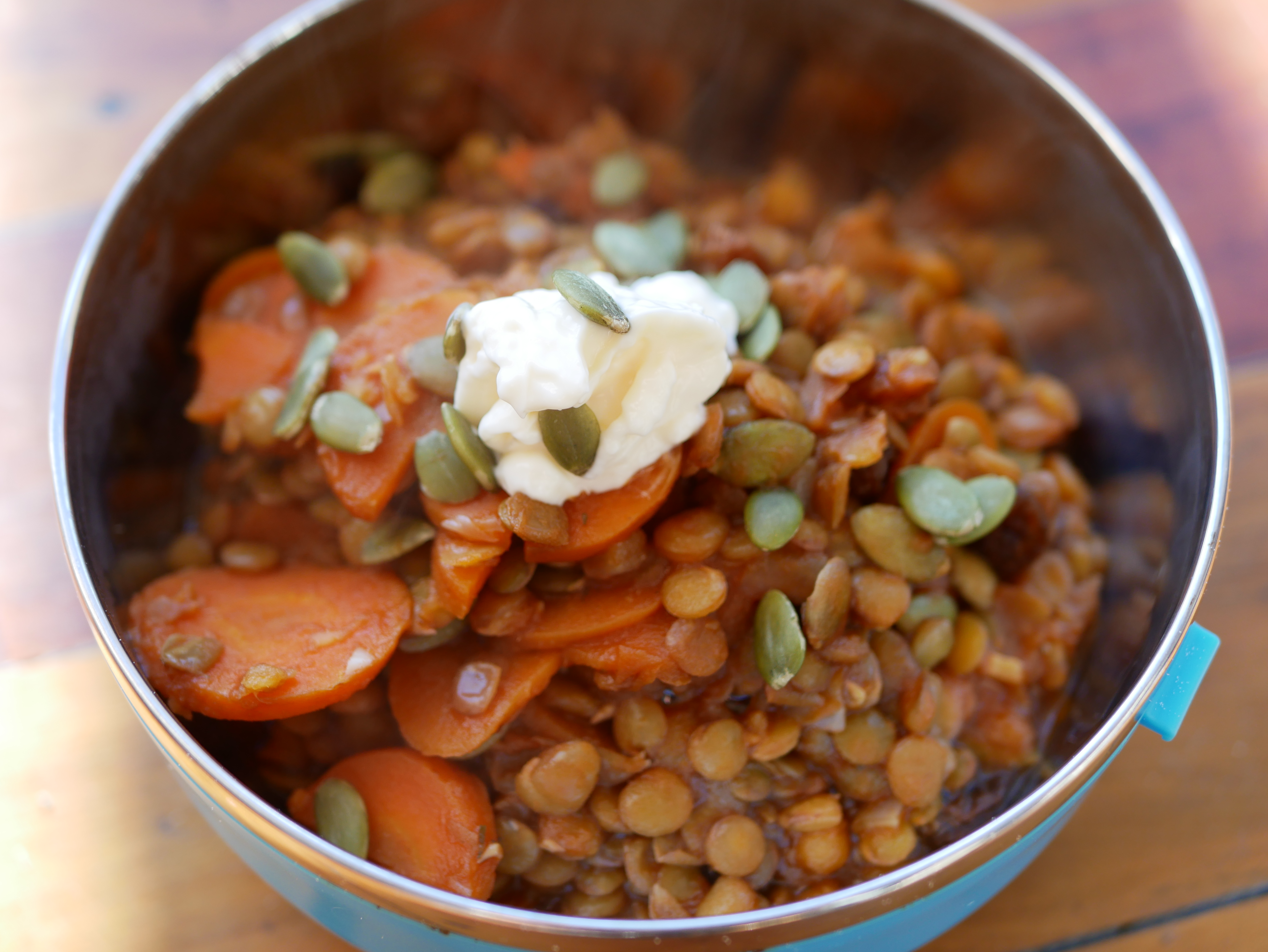 This meal is best cooked over a campfire or on a hut fireplace as it takes a little while for the lentils to cook through. For a faster cook time, soak the lentils in water for a couple of hours prior to cooking. It is best served on mash or with sausages. I enjoy topping the stew with a dollop of sour cream or yoghurt and a sprinkling of chilli flakes.