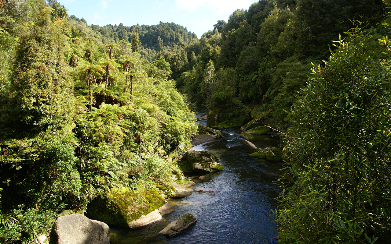 Tawarau Forest starts off light and airy, with lovely clearings beside the stream below, insects buzzing through the heavily scented air and pongas framing the view to the magnificent limestone faces across the stream.