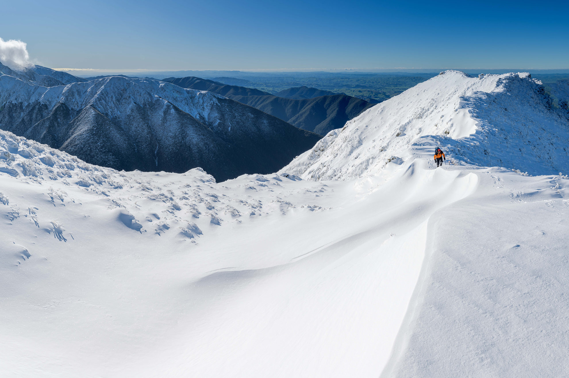 By the time the snow reaches above my gaiters, I am beginning to regret wearing shorts. In a southerly that is supposed to be dying, Peter Laurenson and I are post-holing up Raingauge Spur. As we’ve climbed, the snow has steadily gathered depth, thickly coating the ground and trees. Flakes ghost through the air in small gusts. It’s a winter wonderland, but daylight is failing, and our progress has ground almost to a halt.